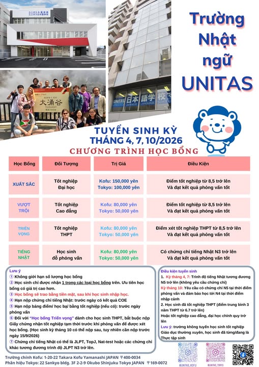 Trường Nhật ngữ Unitas – một trong những hệ thống trường tiếng Nhật uy tín tại Nhật Bản – chính thức triển khai tuyển sinh kỳ tháng 7 và tháng 10 năm 2026 tại hai cơ sở Unitas Kofu và Unitas Tokyo. Đây là cơ hội phù hợp cho các bạn học sinh, sinh viên đang có kế hoạch du học Nhật Bản năm 2026, đặc biệt là những bạn mong muốn nhận học bổng trực tiếp từ nhà trường.